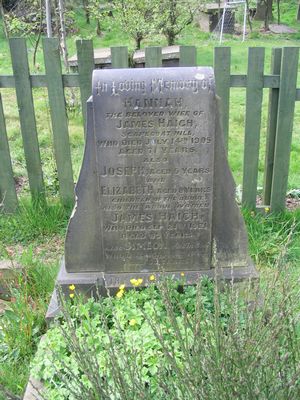 Grave B5 HAIGH In Loving Memory of Hannah the beloved wife of James Haigh, Scapegoat Hill, who Died July 14th 1905 aged 71 years. Also Joseph, aged 5 years. And Elizabeth aged 8 years. children of the above. Also the above named James Haigh, who died Sep. 21st 1921, aged 85 years. Also Simeon, their son who died May 8th 1927 aged 53 years. Thy will be done.
