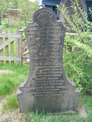 Grave E100 BEAUMONT SHAW In Memory of John Beaumont of Crimble, Golcar who died Feb 25th 1866 aged 26 years Also of Lincoln son of John and Mary Shaw born May 6th 1870 died 8th July 1877 Also of Lucy Ann their beloved daughter born June 10th 1879 died June 17th 1889 Also the above named Mary Shaw born April 15th 1841 died June 3rd 1903 Also Ellen Shaw daughter of the above who died January 19th 1905 aged 27 years