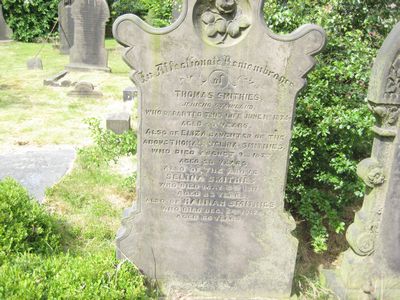 Grave E28 SMITHIES In Affectionate Remembrance of Thomas Smithies Jericho Stainland who departed this life June 1sr 1874 aged 50 years Also Eliza daughter of the above Thomas & Selina Smithies who died August 9th 1877 aged 26 years Also of the above Selina Smithies who died May 3rd 1911 aged 83 years Also of Hannah Smithies who died Dec 2nd 1912 aged 66 years