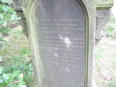 Grave E35 SINGLETON In Memory of Peter Singleton of Scape Goat Hill who died July 30th 1873 aged 69 years Also of Charlotte wife of the above Peter Singleton who died February 22nd 1891 aged 86 years Also of William Singleton their son who died Oct 15th 1892 aged 49 years Also of Martha the beloved wife of the above William Singleton who died Sept 1st 1911 aged 66 years