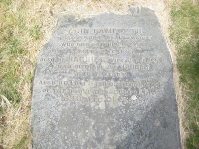 Grave E43 BAMFORTH In Memory of John Bamforth of Wortshill, Slaithwaite who died October 11th 1872 aged 69 years Also of Harriet wife of the above who died August 16th 1883 aged 71 years Also of Tom Bamforth grandson of the above who died Oct 13th 1890 aged 21 years