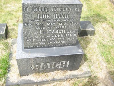 Grave E55 HAIGH In Loving Memory of John Haigh, Brook Glen, Slaithwaite who died May 13th 1903 aged 65 years Also of Elizabeth relict of the above John Haigh who died Dec 17th 1915 aged 76 years “Simply to thy cross I cling” HAIGH Also four of their children who died in infancy