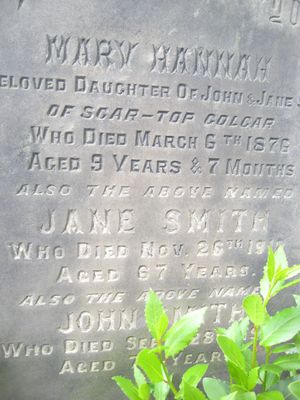 Grave E97 SMITH In Loving Memory of Mary Hannah beloved daughter of John & Jane Smith of Scar Top, Golcar who died March 6th 1876 aged 9 years & 7 months Also the above named Jane Smith who died Nov 26th 1912 aged 67 years Also the above named John Smith who died Sept 28th 1922 aged 78 years