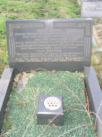 BEAUMONT To the dear memory of James Wilton beloved husband of Elizabeth Ellen Beaumont, Died Jan. 19th 1919, aged 54 years. Also Tom, their son killed in France March 7th 1917, aged 28 years. Also Elizabeth Ellen, beloved wife of the above Died March 2nd 1938, aged 74 years. Also Arthur, beloved husband of Sarah Alice Beaumont, Died March 29th 1955, aged 60 years. Also the above Sarah Alice Beaumont, Died September 16th 1975, aged 77 years. |
