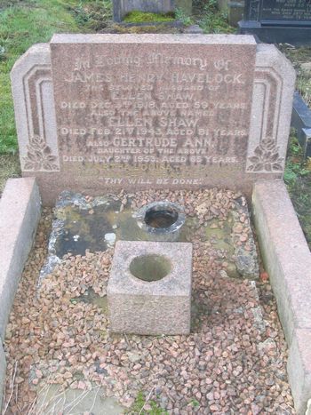 A125 SHAW In Loving Memory of James Henry Havelock, the beloved husband of Ellen Shaw Died Dec. 3rd 1918, aged 59 years. Also the above Ellen Shaw, Died Feb. 21st 1943, aged 81 years. Also Gertrude Ann, daughter of the above Died July 2nd 1953 aged 65 years. Also Martha Louisa, their daughter died Jan. 24th 1969 aged 84 years. “Thy Will be Done” |