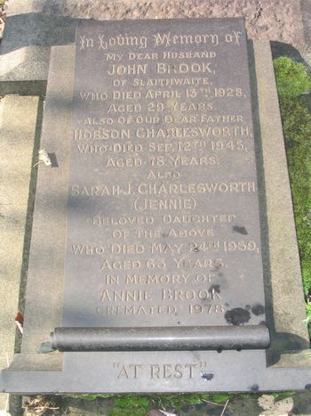 CHARLESWORTH In Loving Memory of my dear husband John Brook, of Slaithwaite, who Died April 13th 1928, aged 29 years. Also of our dear father Hobson Charlesworth, who Died Sep. 12th 1945, aged 78 years. Also Sarah J. Charlesworth (Jennie) beloved daughter of the above who Died May 24th 1959 aged 63 years. In Memory of Annie Brook cremated 1978 “At Rest” |