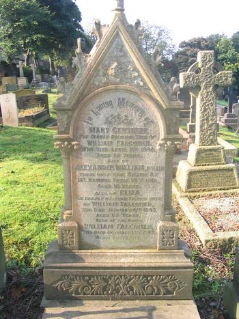 FALCONER In Loving Memory of Mary Gertrude, the dearly beloved wife of William Falconer, who Died April 11th 1902 aged 32 years. Also of Alexander William PTE. N. F. their only son killed at Mt. Kemmel April 14th 1918, aged 18 years. Also of Eliza, the dearly beloved second wife of William Falconer, who Died January 4th 1943, aged 63 years. Also of the above William Falconer, who Died October 12th 1943, aged 80 years. |