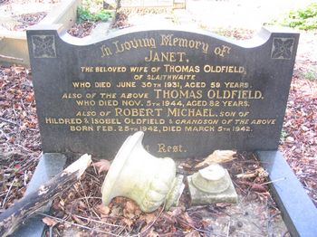 OLDFIELD In Loving Memory of Janet the beloved wife of Thomas Oldfield of Slaithwaite who Died June 30th 1931 aged 59 years. Also of the above Thomas Oldfield who Died November 5th 1944 aged 82 years. Also of Robert Michael, son of Hildred and Isobel Oldfield & grandson of the above Born Feb . 25th 1942, Died March 5th 1942. At Rest.