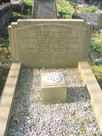 HEY In Loving Memory of a Dear Wife and Mother Isobel C. Hey, who Died 21st September 1954, aged 69 years. Also of a Dear Husband and Father Edgar C. Hey who Died 10th March 1957, aged 77 years. Also Ruth Ellen and Willie, children of the above who Died in infancy. |