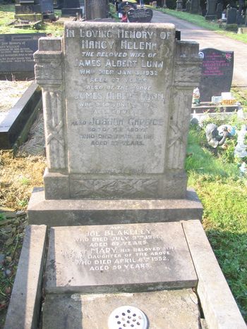 BLAKELEY In Loving Memory of Nancy Helena the beloved wife of James Albert Lunn who Died Jan. 3 1932 aged 67 years. Also of the above James Albert Lunn who Died June 29 1942 aged 80 years. Also Joshua Garside son of the above who Died April 11 1911 aged 27 years. Thy will be done Also Joe Blakeley, who Died July 9th 1955 aged 67 years. Also of Mary, his beloved wife and daughter of the above who Died April 6th 1952 aged 59 years. |