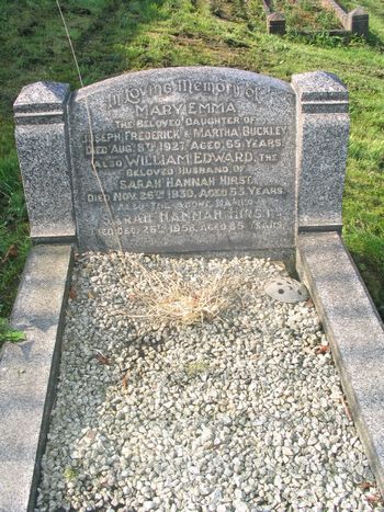 BUCKLEY HIRST In Loving Memory of Mary Emma the beloved daughter of Joseph Frederick & Martha Buckley Died Aug. 8th 1927 aged 65 years. Also William Edward the beloved husband of Sarah Hannah Hirst Died Nov. 28th 1930 aged 53 years. Also the above named Sarah Hannah Hirst Died Dec. 26th 1958 aged 85 years. |
