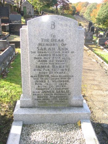 Grave C161 BAILEY WILKINSON To the Dear Memory of Sarah Ann, the beloved wife of James Bailey, died Oct. 23rd 1939, aged 66 years. Also the above James Bailey, died Feb. 25th 1947, aged 75 years. Also Edith, their daughter and dearly loved wife of James L. Wilkinson, died Feb. 1st 1958, aged 56 years. Cremated at Carleton. Also James Leslie, dearly loved husband of Edith Wilkinson died April 17th 1964, aged 70 years. Also Tom, son of James and Sarah Ann Bailey, the dearly loved hudband of Jenny died 8th February 1990 aged 80 years. |