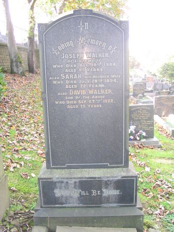 WALKER In Loving Memory of Joseph Walker, of Linthwaite, who died Aug. 18th 1904, aged 83 years. Also Sarah, his beloved wife who died July 28th 1894, aged 72 years. Also David Walker, son of the above who died Sep. 27th 1922, aged 75 years. Thy will be done. |