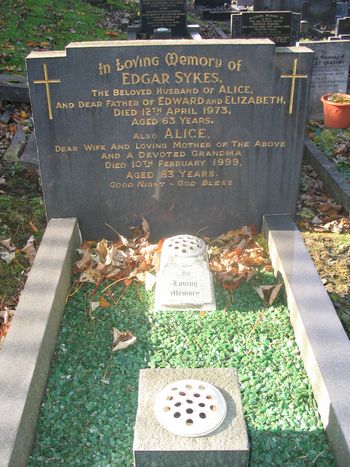 SYKES In Loving Memory of Edgar Sykes, the beloved Husband of Alice, and dear Father of Edward and Elizabeth, died 12th April 1973, aged 63 years. Also Alice, dear Wife and loving Mother of the above and a dear Grandma died 10th February 1999, aged 83 years. Good Night – God Bless. |
