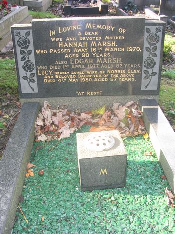 CLAY In Loving Memory of a Dear Wife and Devoted Mother Hannah Marsh, who passed away 16th March 1970, aged 90 years. Also Edgar Marsh, who died 1st April 1977, aged 82 years. Lucy, dearly loved wife of Norris Clay, and beloved daughter of the above died 4th May 1980, aged 57 years. “AT Rest” |