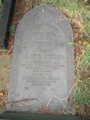 loving memory of Squire Shaw died March 29th 1908 aged 66 years. Also